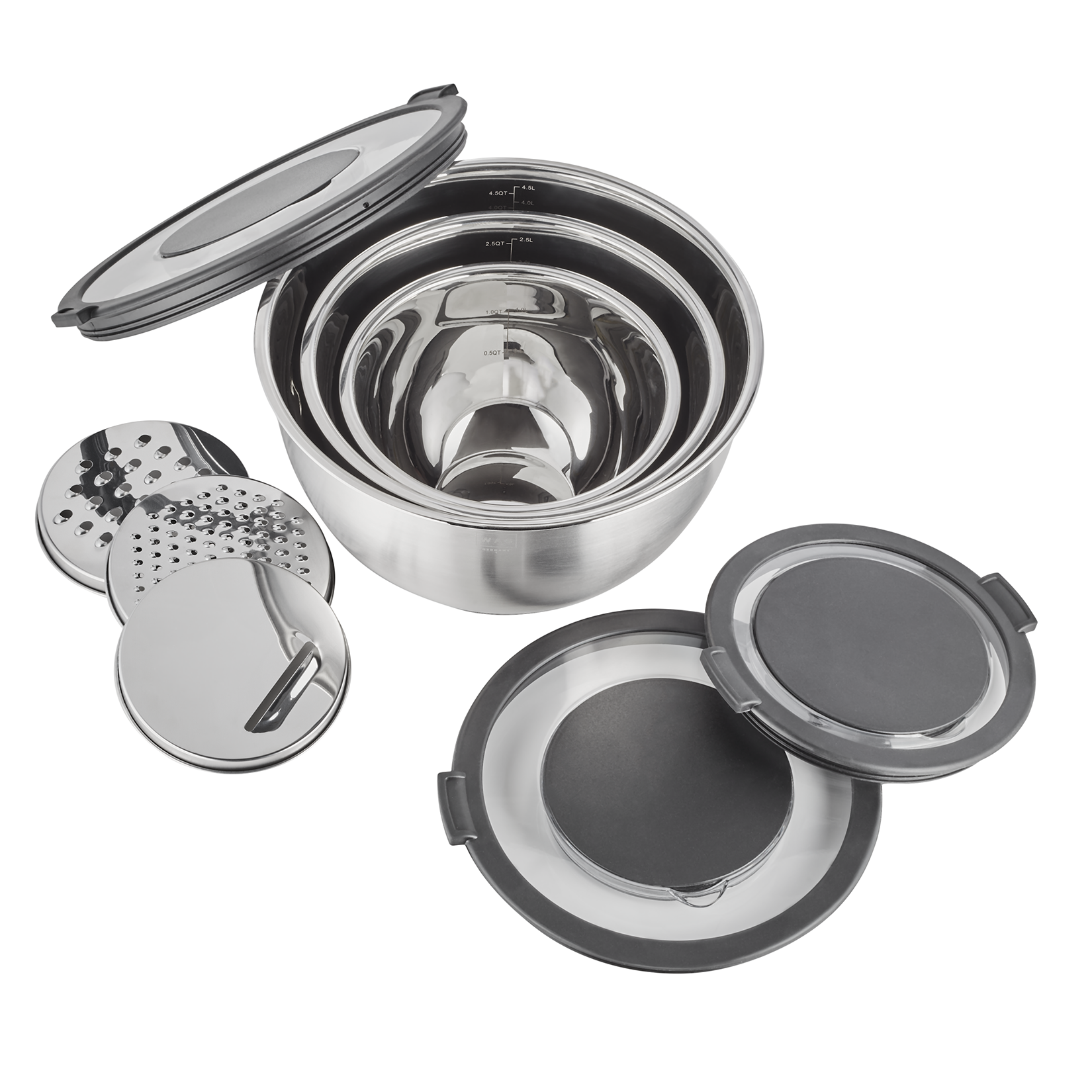 | Artikelbezeichnung | Bowl set, 3 piece, Ø 11/13/15 cm, 3 attachements, non slip bottom, chrome nickel steel, silicone |