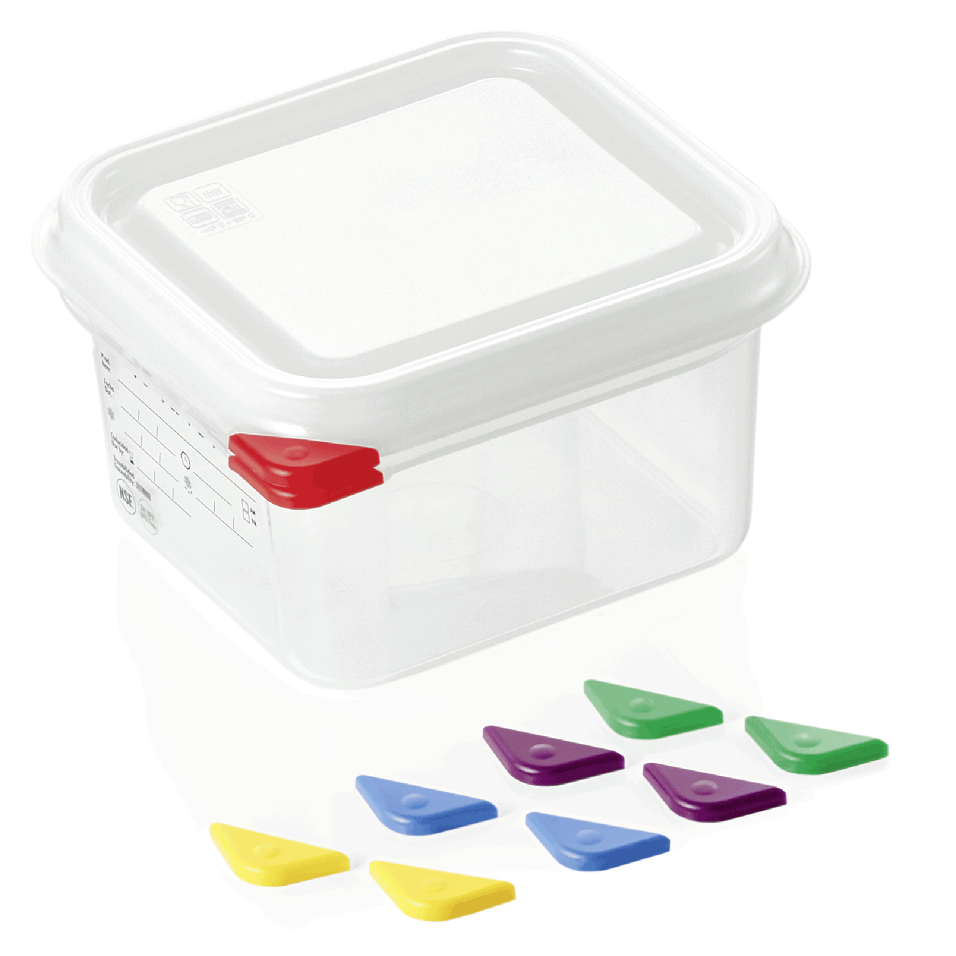 | Beschreibung der Serie | Deckel hermetisch schließend / inklusive 5 Markierungs-Clips in den Farben: rot, blau, gelb, grün, lila / Behälter sind beschreibbar / Mit Skalierung / Lieferung inkl. Deckel |