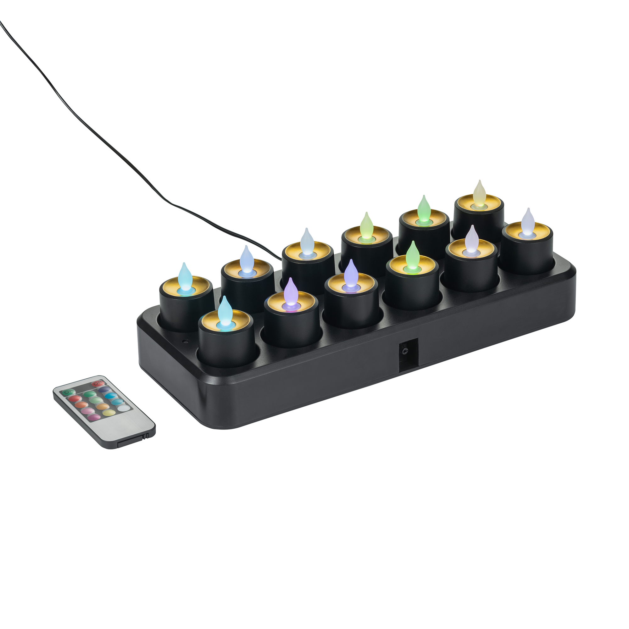 | Beschreibung des Artikels | Mit Multi-Color-Funktion, wiederaufladbar, mit Induktion für 12 Teelichter, realistischer Flackermodus für eine kerzenähnliche Atmosphäre, wasserresistent (IP54) – ideal für drinnen und draußen, erweiterbar auf bis zu 24 Teelichter mit zusätzlicher Ladestation, Fernbedienung für mühelose Farbwahl |